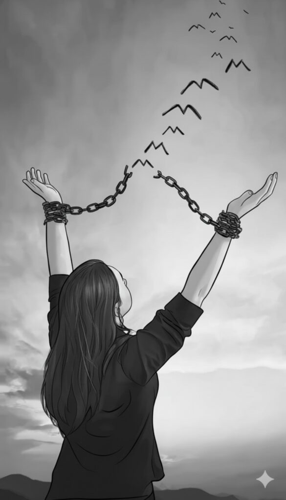 As her hands reached higher, the birds scattered across the sky like scattered thoughts finally set free. The chains stretched, trembling now, unsure of their purpose. They had been built on fear, but fear does not survive forever when faced with truth.