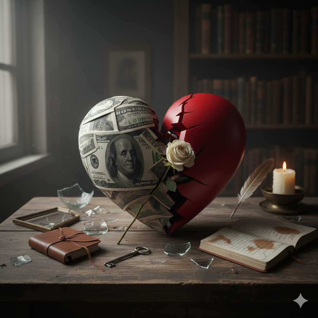 They found the heart on an old oak table in the back of the forgotten library, where dust turned sunlight into quiet gold. It was an impossible heart—half wrapped in hundred-dollar bills, the other half red and cracked like porcelain. A single white rose bloomed from its fault line, fragile yet stubborn, as if determined to root itself in pain.